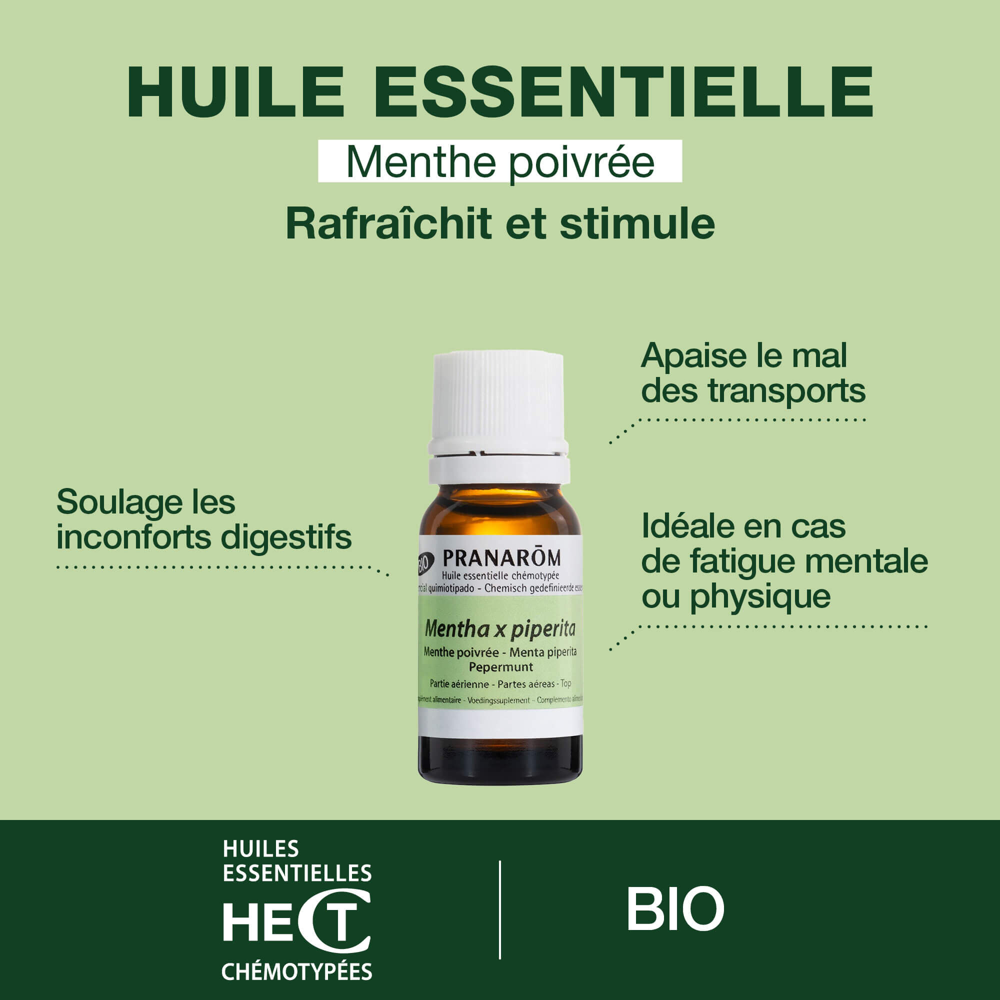 Réputée pour son effet rafraîchissant et antispasmodique, l'Huile Essentielle de Menthe poivrée aide à soulager les ballonnements, les nausées et les spasmes digestifs. Elle agit aussi contre les douleurs abdominales liées à une mauvaise digestion.