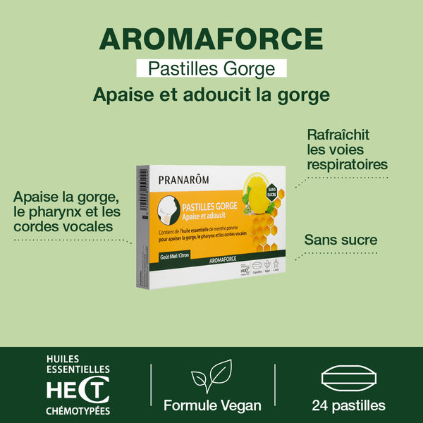 Associent l’Essence de Citronnier et l’Huile Essentielle de Menthe poivrée pour accompagner le confort de la gorge et des cordes vocales, dès 6 ans.