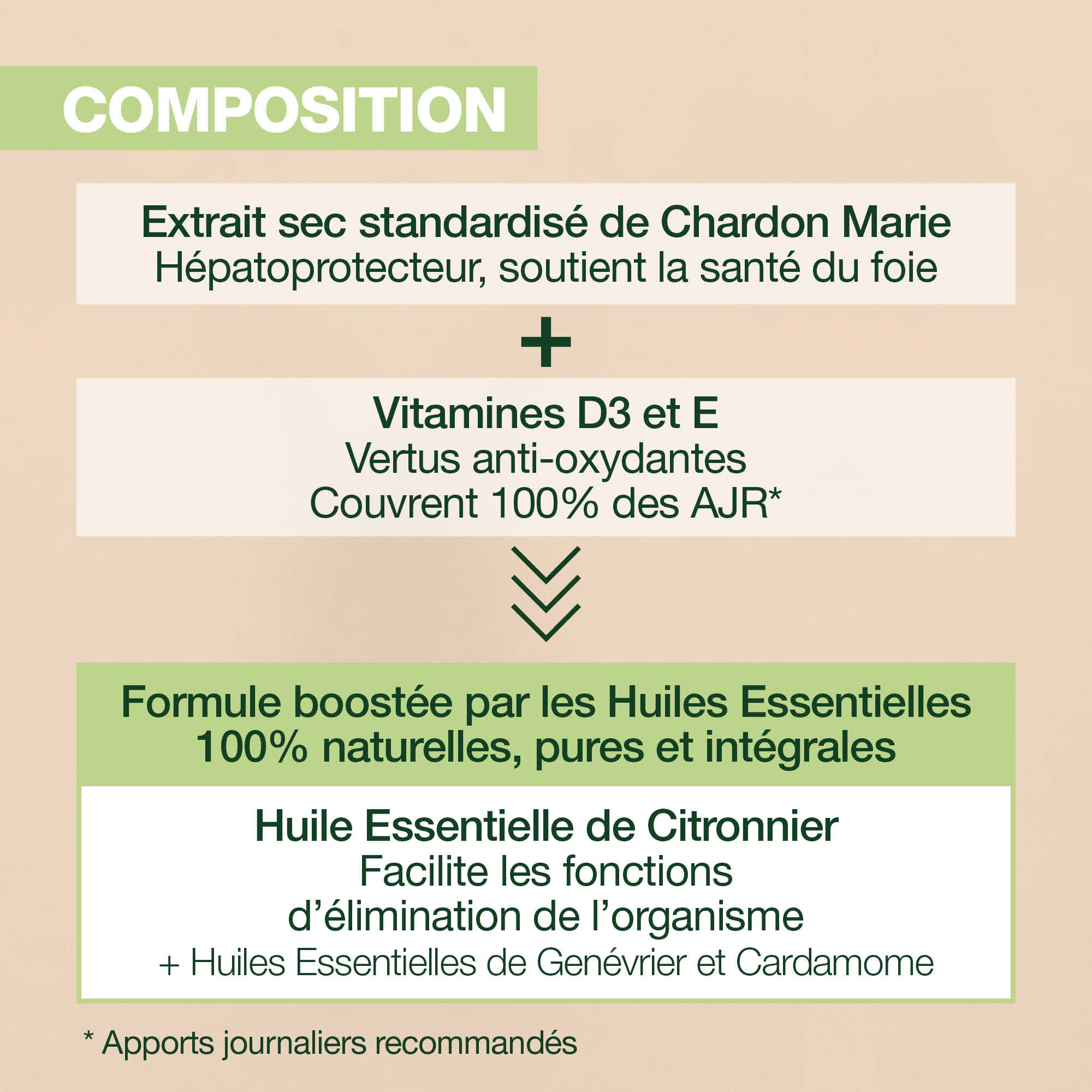 Les capsules Aromaboost DETOX,un complexe unique pour éliminer les toxines, à base de Chardon Marie, du Zinc, des vitamines D3 et E boostés par les Huiles Essentielles Pranarôm