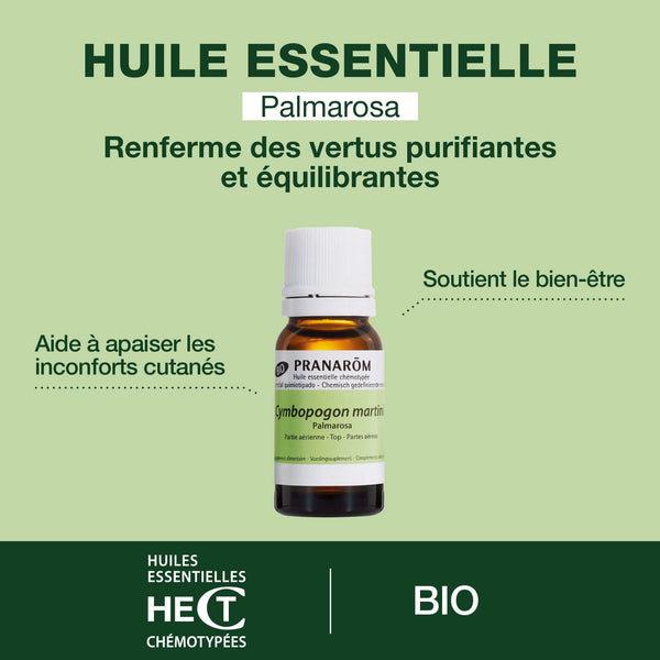 Utilisation : Pour un massage apaisant, diluez quelques gouttes d’huile essentielle de palmarosa dans une huile végétale et appliquez sur le bas du ventre. Massez doucement pour favoriser la détente et aider à soulager les douleurs liées à l’infection. Pour un soin global, ajoutez quelques gouttes de palmarosa à votre bain tiède, en prenant soin de diluer l’huile dans une base neutre pour bain (comme un peu de gel douche naturel ou des sels d’Epsom).