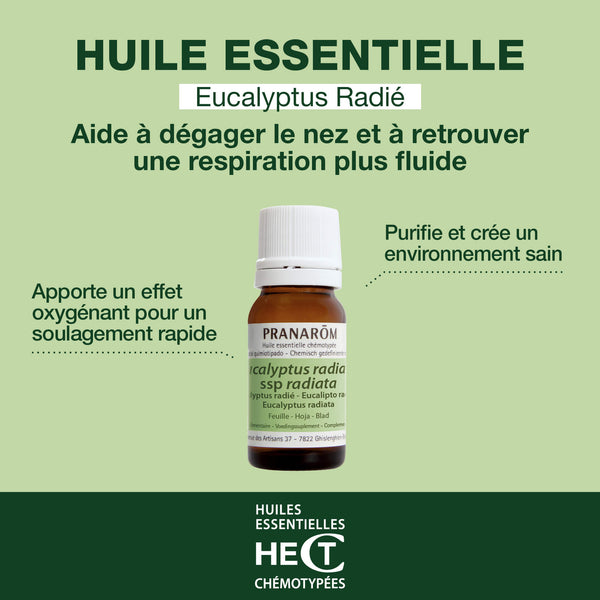 Associent des Huiles Essentielles BIO (Ravintsara, Eucalyptus globuleux, Eucalyptus mentholé) pour une inhalation simple et naturelle, idéale lorsque le nez est encombré.