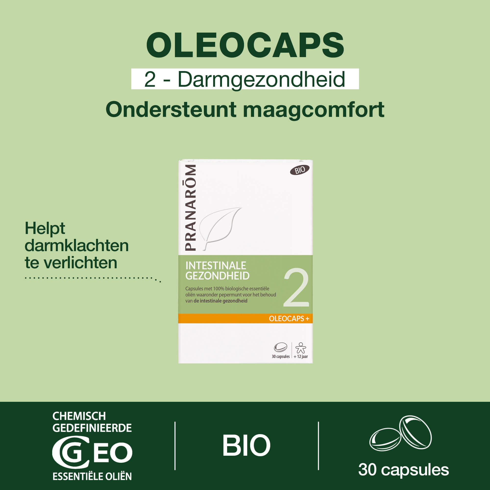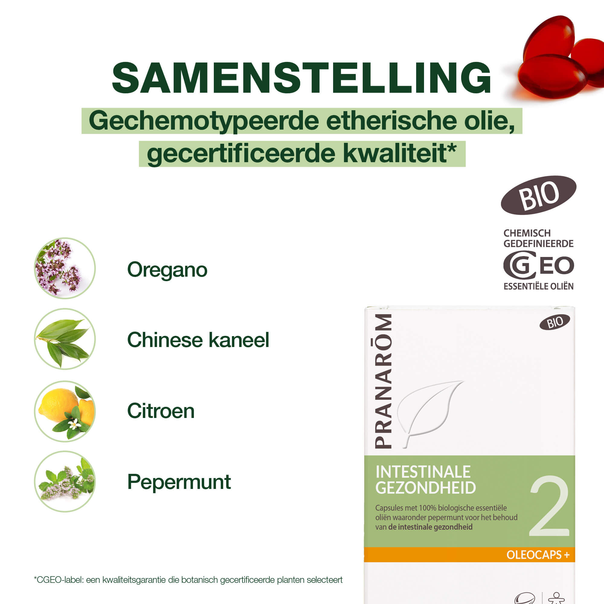 Capsules met 100% biologische essentiële oliën waaronder pepermunt voor het behoud van de intestinale gezondheid