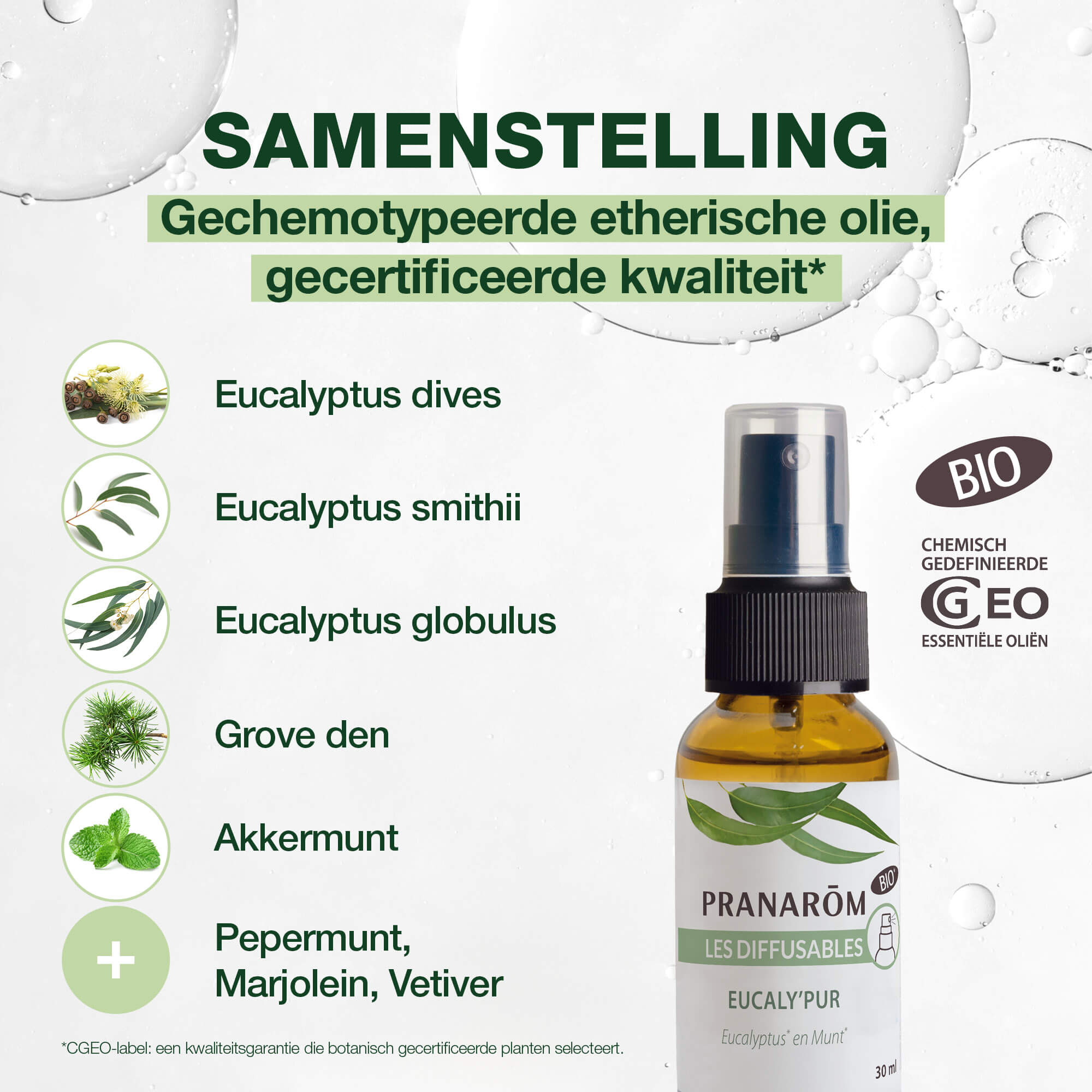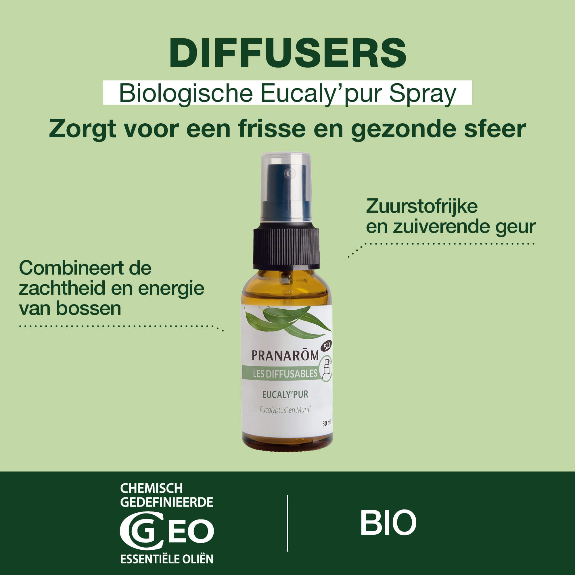Purifiez l'air de votre intérieur grâce au Diffusable en spray Eucaly'Pur BIO aux Huiles Essentielles d'Eucalyptus et de Menthe.