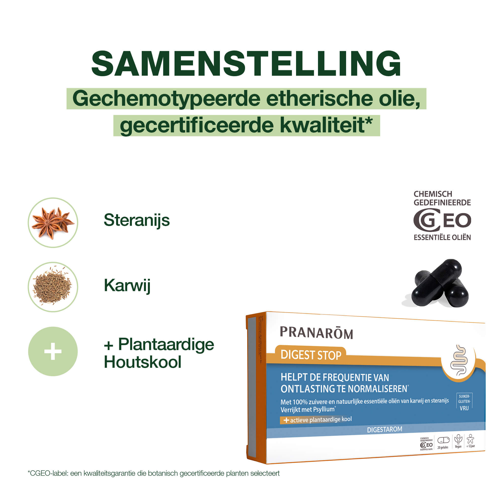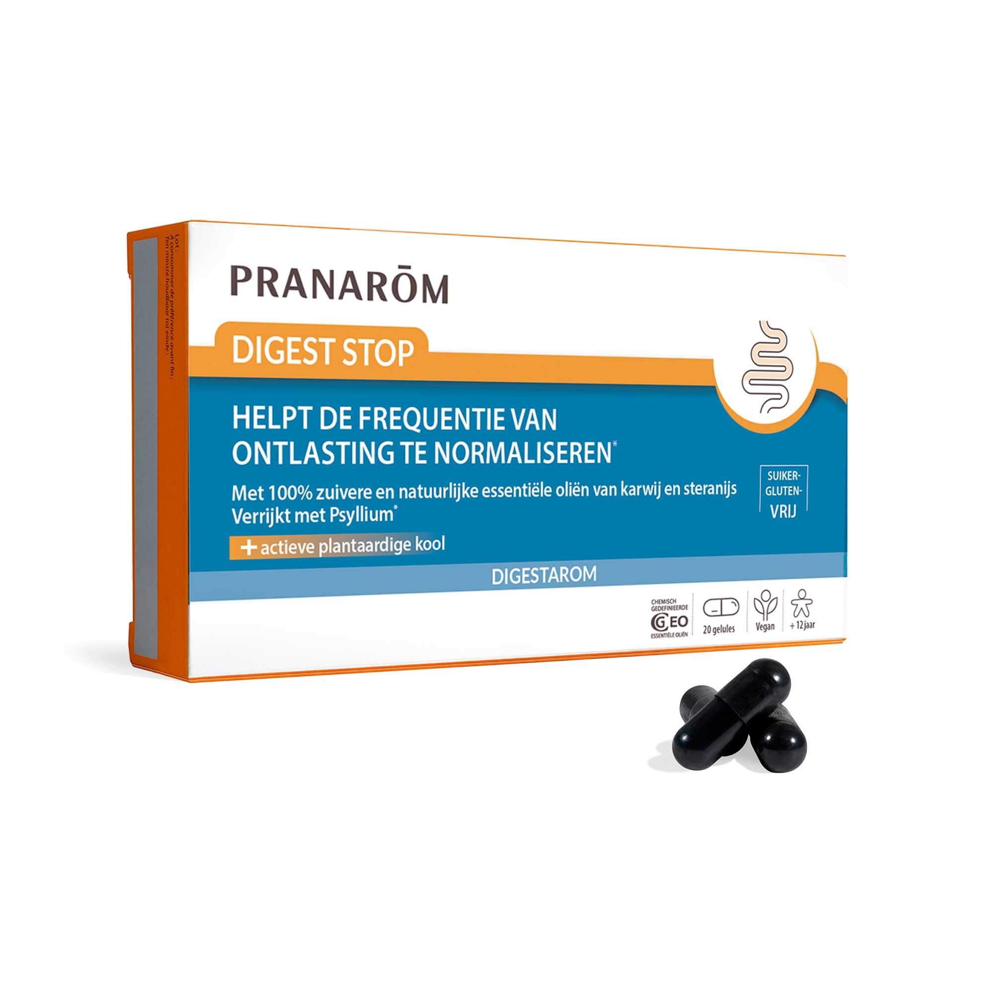 Digest Stop is een voedingssupplement met essentiële oliën van steranijs en karwij, geactiveerde plantaardige houtskool en psyllium om de stoelgang te normaliseren.