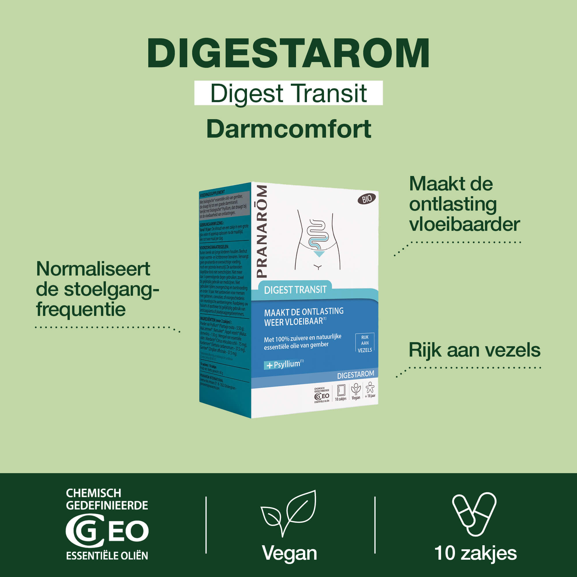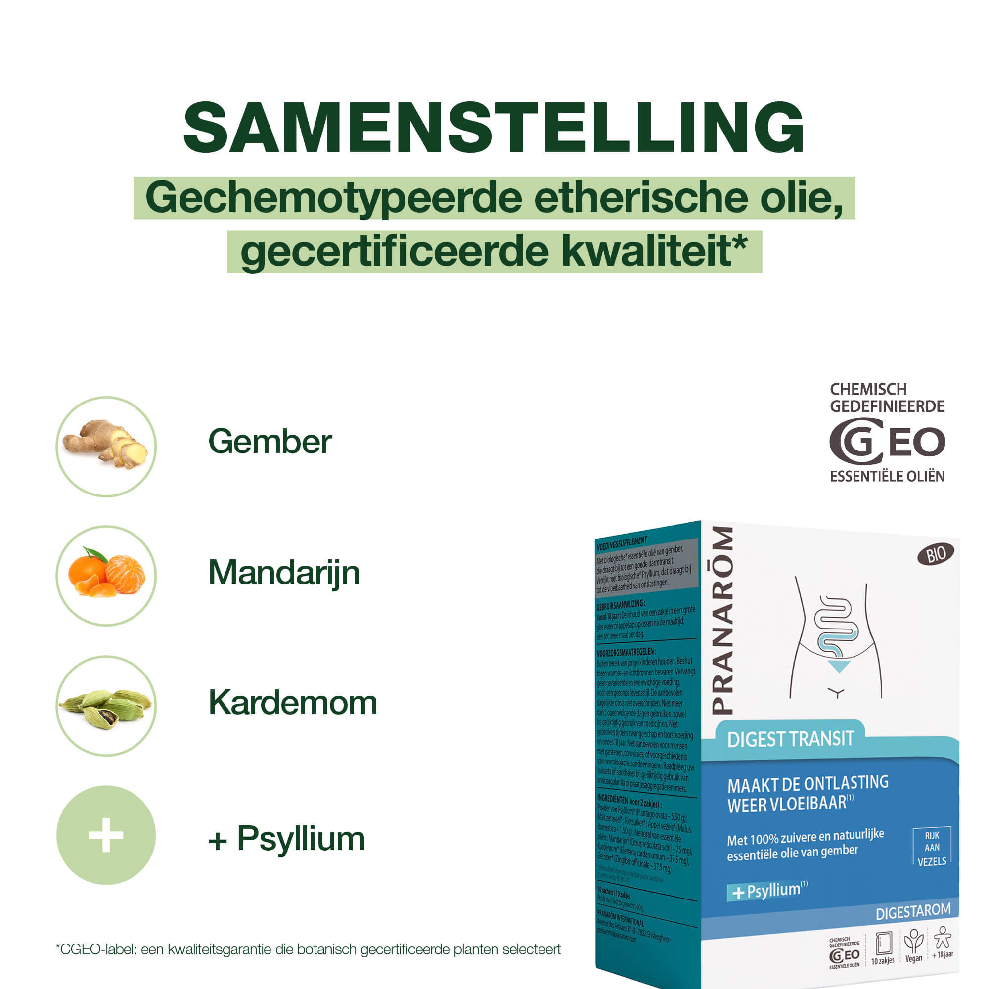 INGREDIËNTEN (voor 2 zakjes) : Poeder van Psyllium* (Plantago ovata – 5.50 g); Maïs zetmeel* ; Rietsuiker* ; Appel vezels* (Malus domestica – 1.50 g) ; Mengsel van essentiële oliën : Mandarijn* (Citrus reticulata schil – 75 mg), Kardemom* (Elettaria cardamomum – 37.5 mg), Gember* (Zingiber officinale – 37.5 mg).