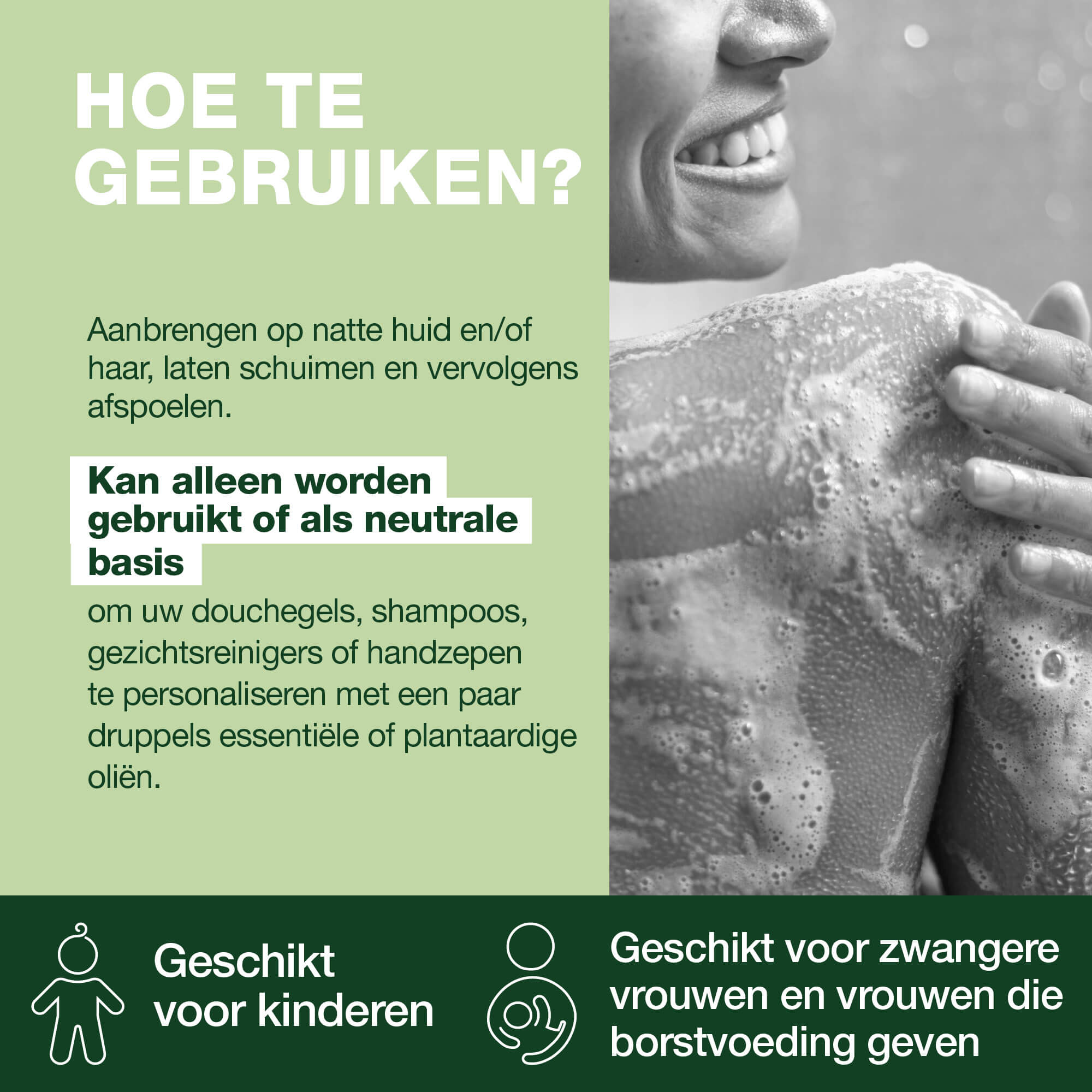 Aanbrengen op natte huid en/of haar, laten schuimen en afspoelen.
