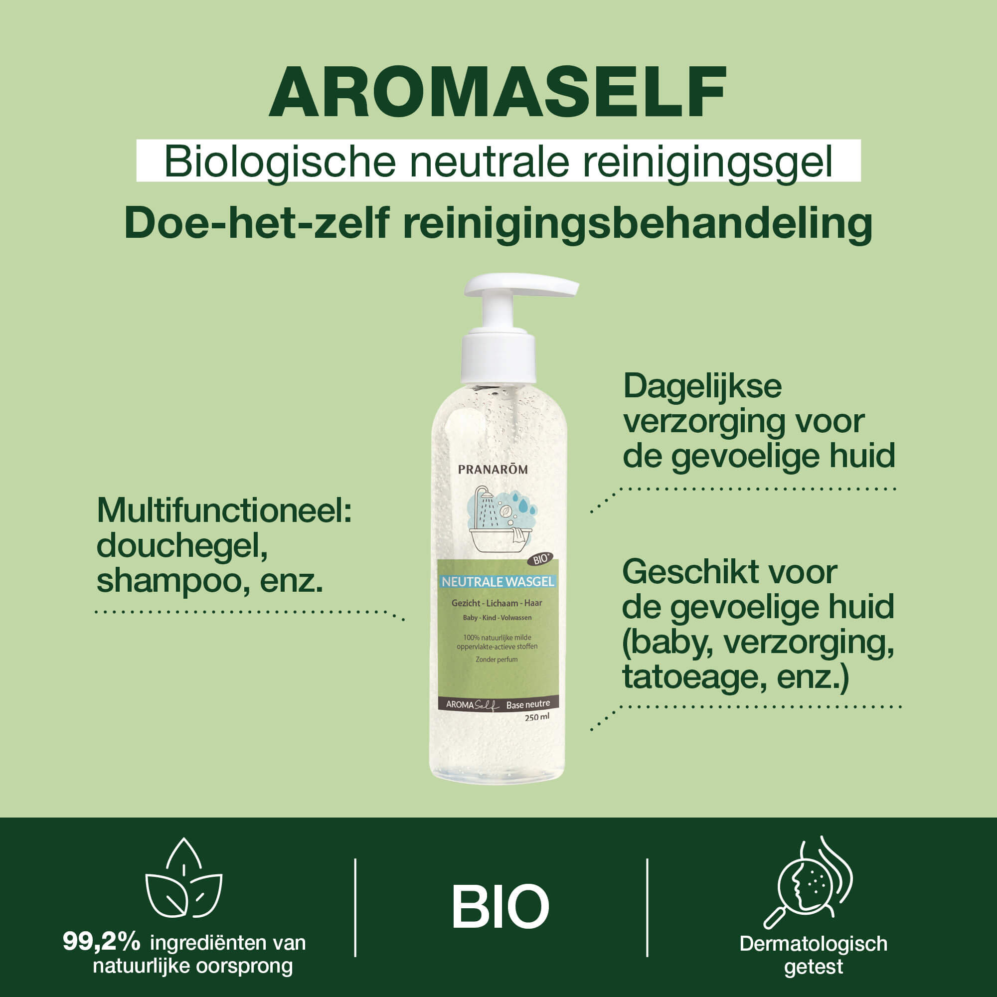 De AROMASELF Neutral Cleansing Gel is ontworpen om op milde wijze te reinigen, met respect voor alle huidtypes, inclusief de meest kwetsbare en reactieve. De natuurlijke formule maakt het een must-have keuze, of het nu gaat om een douchegel, shampoo voor peuters of voor een gevoelige huid, bijvoorbeeld na een dermatologische behandeling of een tatoeage.