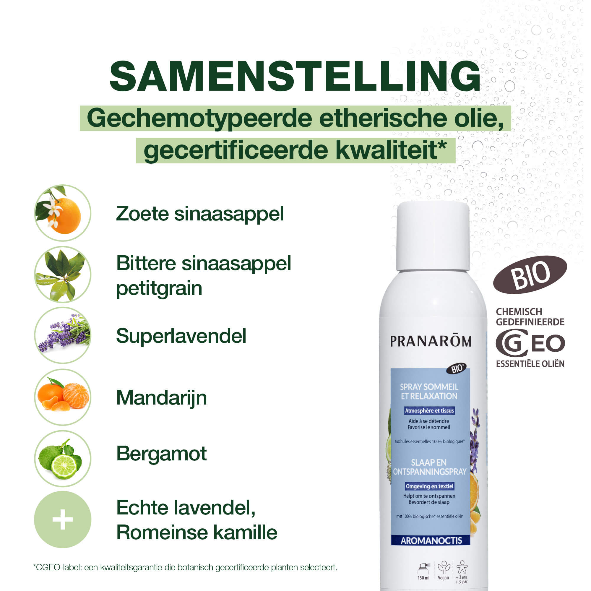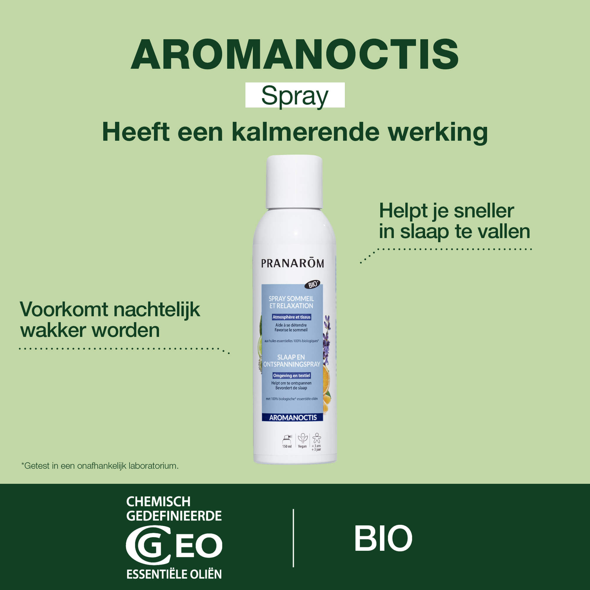 De AROMANOCTIS Slaap- en Ontspanningsspray van Pranarôm is een natuurlijke olfactorische oplossing die de rustgevende werking bevordert, het inslapen vergemakkelijkt en het nachtelijk ontwaken beperkt.