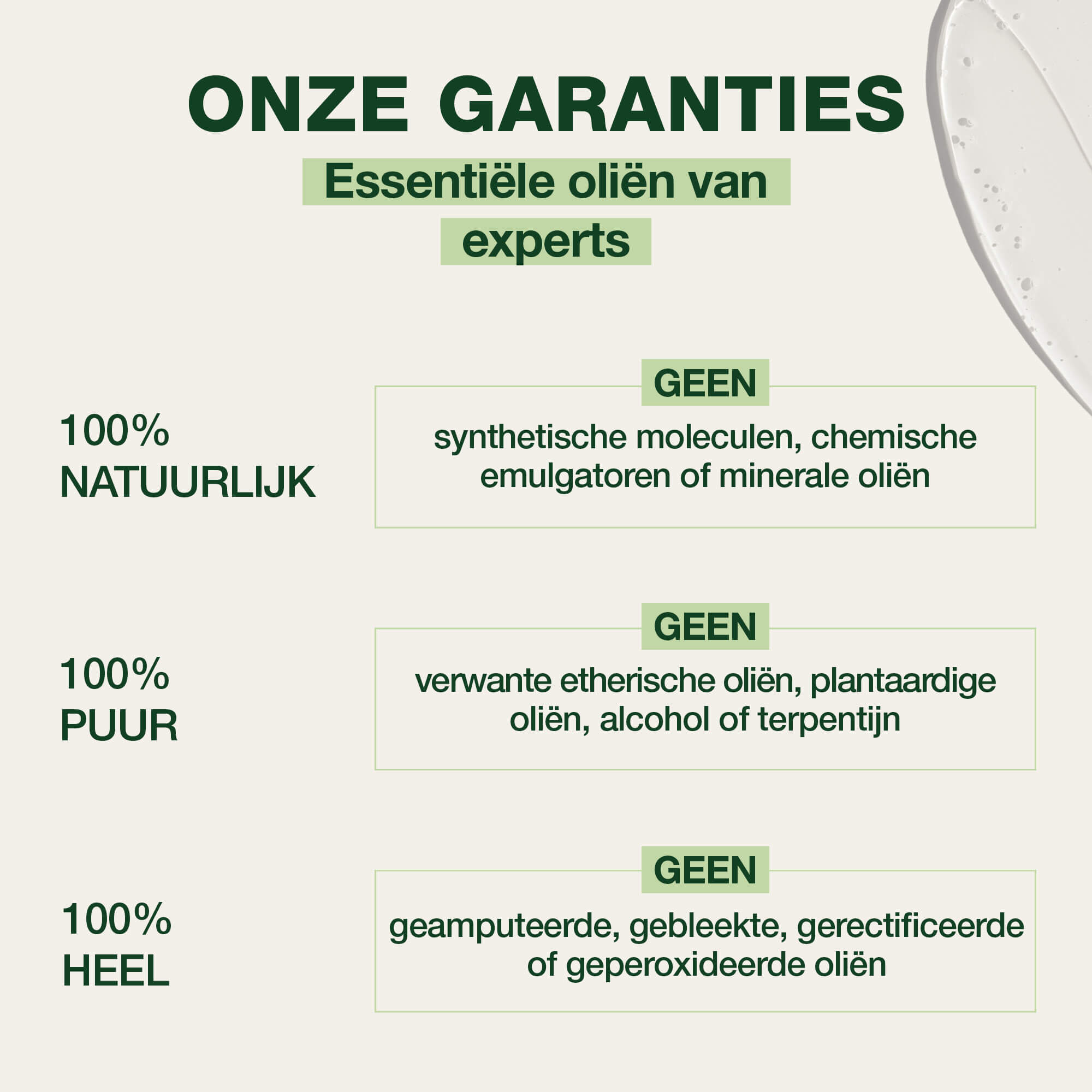 Prunus armeniaca pitolie* (Abrikozenpit), Cymbopogon martini olie* (Palmarosa), Cymbopogon citratus bladolie* (Citroengras), Melaleuca quinquenervia olie* (Niaouli), Lavandula hybrida olie* (Lavandin super), Cymbopogon giganteus olie* (Madagaskar citroengras), Eugenia caryophyllus bladolie* (Kruidnagel), Hypericum perforatum extract* (Sint-janskruid), Olea europaea fruitolie* (Olijf), Cedrelopsis grevei olie* (Katrafay), Tocoferol, Citral**, Citronellol**, Coumarine**, Eugenol**, Farnesol**, Geraniol**, Limoneen**, Linalool**.