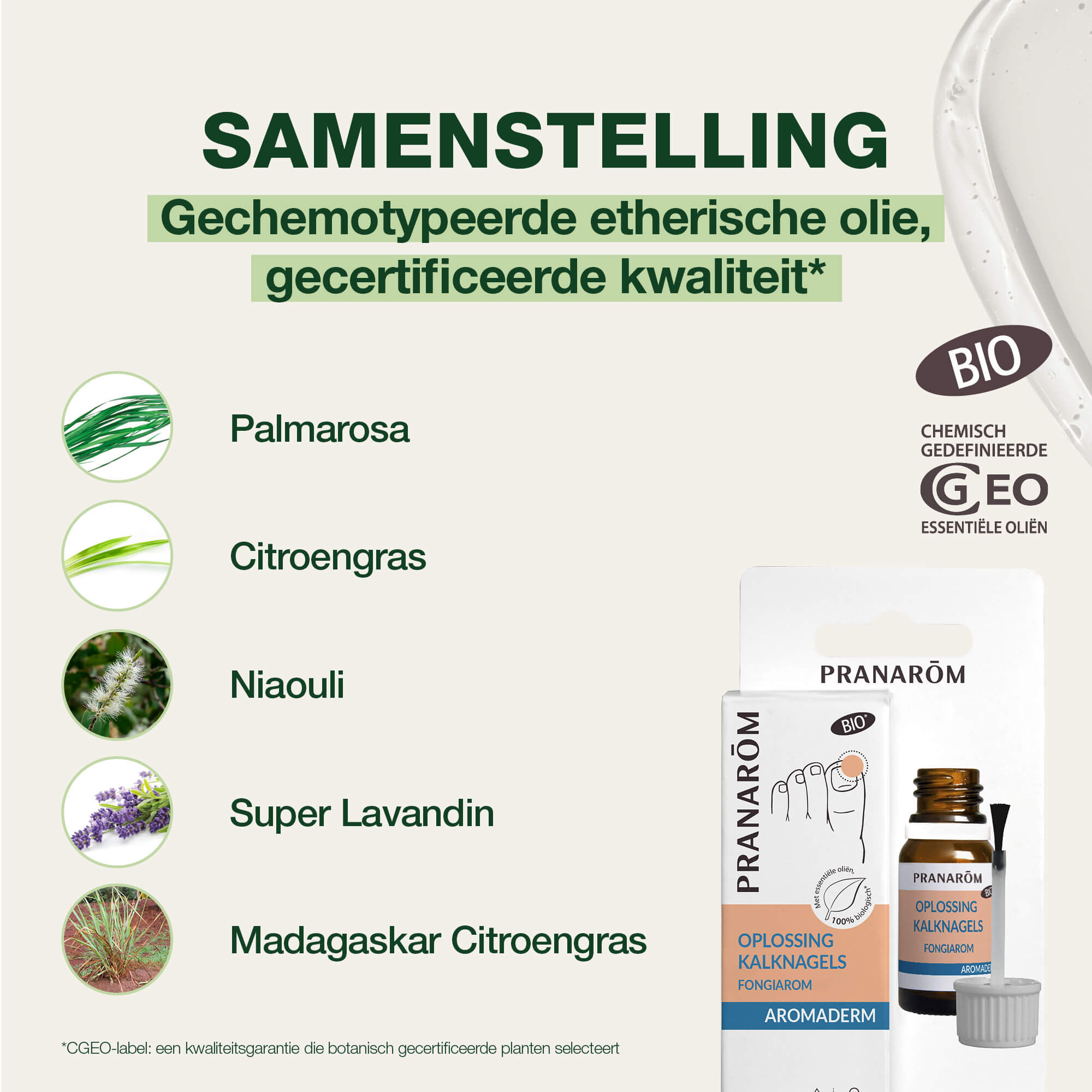 De unieke formule combineert etherische olie van citroengras (Cymbopogon flexuosus), bekend om zijn zuiverende en verstevigende eigenschappen, etherische olie van Niaouli (Melaleuca quinquenervia), traditioneel gebruikt om de huidhygiëne te bevorderen en etherische olie van Palmarosa (Cymbopogon martinii), bekend om zijn zuiverende en herbalancerende eigenschappen. Samen helpen ze om een omgeving te behouden die bevorderlijk is voor gezond ogende nagels.