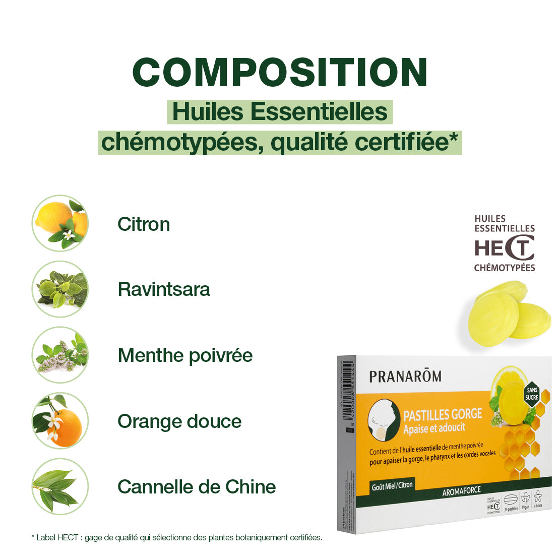Associent l’Essence de Citronnier et l’Huile Essentielle de Menthe poivrée pour accompagner le confort de la gorge et des cordes vocales, dès 6 ans.